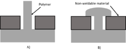 IR staking includes the localized welding of a thermoplastic stud or stake from one part into the cavity of a non-weldable part to form a mechanical fastener. As shown in the figure to the right, the polymer part and non-weldable part are first placed together (A), then the projecting polymer is melted and formed around the non-weldable part to fasten the two together (B). The stud can be heated through directed TTIr when pre-placed within the cavity of an IR transparent part, then melted to deform it into a button shape required to fill the cavity before solidifying. Surface IR radiation can also be used to soften a plastic stud which is then pressed into a button-shaped die to form a head before cooling and solidifying.[1]