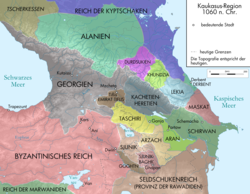 In the beginning the kings of Kakheti were allies of Georgian kings in fights against foreign aggressors. In 1022, Kvirike III sent reinforcement to George I of Georgia against the Byzantine Empire, however they were defeated. In 1027, Kvirike joined the combined armies of Bagrat IV of Georgia led by Liparit Baguashi and Ivane Abazasdze, Emir Jaffar of Tiflis, and the Armenian King David I of Lorri against the Shaddadid emir of Arran, Fadhl II, who was decisively defeated at the Eklez River. Around 1029, Kvirike III defeated an invasion force led by the Alan king Urdure who had crossed the Caucasus Mountains into Kakheti and ravaged Tianeti. Urdure was killed in battle.[2] At the zenith of his power and prestige, Kvirike was assassinated while hunting in 1037/39. According to the Georgian historian Vakhushti, this was done by Kvirike's Alan slave who sought to avenge for the death of King Urdure. On Kvirike’s death, Kakheti was temporarily annexed to the Kingdom of Georgia.[3][4]