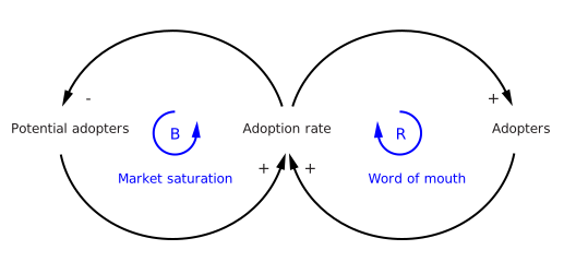 The second feedback loop on the left is negative reinforcement (or "balancing" and hence labeled B). Clearly, growth cannot continue forever, because as more and more people adopt, there remain fewer and fewer potential adopters.