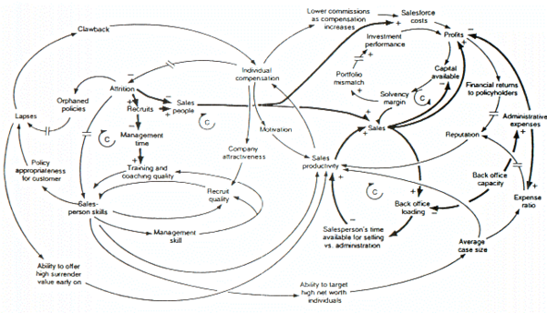 The figure above is a causal loop diagram of a system dynamics model created to examine forces that may be responsible for the growth or decline of life insurance companies in the United Kingdom . A number of this figure's features are worth mentioning. The first is that the model's negative feedback loops are identified by C's, which stand for Counteracting loops. The second is that double slashes are used to indicate places where there is a significant delay between causes (i.e., variables at the tails of arrows) and effects (i.e., variables at the heads of arrows). This is a common causal loop diagramming convention in system dynamics. Third, is that thicker lines are used to identify the feedback loops and links that author wishes the audience to focus on. This is also a common system dynamics diagramming convention. Last, it is clear that a decision maker would find it impossible to think through the dynamic behavior inherent in the model, from inspection of the figure alone.[15]