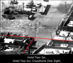 In April, a classified video of the 12 July 2007 Baghdad airstrike was released, showing two Reuters employees being fired at after the pilots mistakenly thought the men were carrying weapons, which were in fact cameras.[474] After the men were killed, the video shows US forces firing on a family van that stopped to pick up the bodies.[475] Press reports of the number killed in the attacks vary from 12 to "over 18".[476][477] Among the dead were two journalists and two children were also wounded.[478][479]