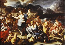 The Bible mentions many uses of music including songs of praise, songs of victory, songs of mourning, and above all the Psalms. Dances were also a common music expression along with the combination of singing with instrumental music. During later times there was also a purely vocal music which prevailed for a period.[5] According to Ulrich, music played an important part in both the secular and the religious life of the Hebrews. Kings and other leaders of the people were customarily acclaimed in songs and fanfares, and very elaborate musical services in the Temple, described in the Bible, were important parts of worship. There are, for instance, descriptions in the Bible of an orchestra consisting of nine lutes, two harps, and a cymbal.[5] In other parts there are accounts of all-women choirs combined with singing and dancing to the men's percussion accompaniment. Werner adds that the choir's repertoire consisted of psalms, canticles, and other poetic passages from Scripture, although it may have contained some noncanonical texts. The choice of psalms is said to have been determined by God's activities on the first seven days of creation, and the verses which allude to them.[9]:13