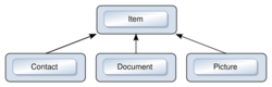 Any object represented as a data unit, such as contact, image, video, document etc., can be stored in a WinFS store as a specialization of the Item type.[30] By default, WinFS provides Item types for Files, Contact, Documents, Pictures, Audio, Video, Calendar, and Messages. The File Item can store any generic data, which is stored in file systems as files. But unless an advanced schema is provided for the file, by defining it to be a specialized Item, WinFS will not be able to access its data. Such a file Item can only support being related to other Items.[6]