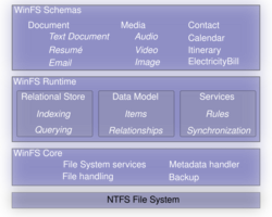 At the bottom of the WinFS stack lies WinFS Core, which interacts with the filesystem and provides file-access and -addressing capabilities.[8] The relational engine leverages the WinFS core services to present a structured store and other services such as locking, which the WinFS runtime uses to implement the functionality. The WinFS runtime exposes services such as Synchronization and Rules that can be used to synchronize WinFS stores or perform certain actions on the occurrence of certain events.[8]