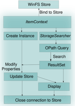 The WinFS API provides a class called the ItemContext class, which is bound to a WinFS store. The ItemContext object can be used to scope the search to the entire store or a subset of it. It also provides transactional access to the store.[15] An object of this class can then spawn an ItemSearcher object which then takes the type (an object representing the type) of the item to be retrieved or the relationship and the OPath query string representing the criteria for the search.[31][33] A set of all matches is returned, which can then be bound to a UI widget for displaying en masse or enumerating individually.[30] The properties items can also be modified and then stored back to the data store to update the data. The ItemContext object is closed (which marks the end of association of the object with the store) when the queries are made or changes merged into the store.