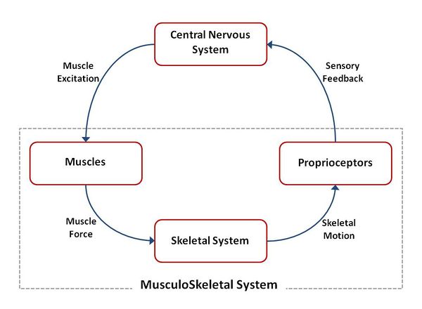 To control the movement of the human body, the central nervous system generates neural commands to activate the contractile apparatus of the muscles. The forces generated by the muscles combine with inertia and external forces that may be acting on the body, resulting in observable movements. The forces and movements of the musculoskeletal system are measured by various proprioceptive sensors and relayed back to the central nervous system, providing it with the information it needs to make appropriate control decisions and adjustments (Figure 1). Cutaneous receptors of the somatosensory system also provide important feedback, but the mechanical dynamics and circuits involved are more complex, less studied, and not well-modeled to date.