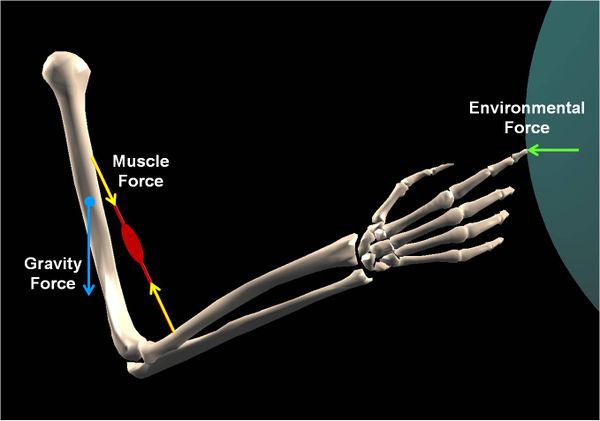 As shown above, external forces are the inputs to and are required for the solution of the skeletal equations of motion. These forces are quantified by their magnitude, direction, and their point of application on the skeletal system. The gravitational force of each segment applies to its center of gravity and is directed toward the center of the earth (Figure 2); because the human or animal movements occur in relatively small spaces, the magnitude of the gravitational force can be assumed to be constant. Motion within the degree(s) of freedom allowed by a joint type is usually constrained by mechanical stops and elastic ligaments associated with the construction of the anatomical joint, which can be modeled as joint angle-dependent external forces acting on the skeleton. Environmental forces arise when the skeletal system contacts the environment such as foot-ground and hand-tool contacts (Figure 2), usually via soft tissue pads that have their own compliance. These forces are modeled by equations that represent the dynamics of the contact between the body segment and the environment. The calculation and the application of a given muscle force is more complicated. The correct calculation and application of muscle force to the skeletal system requires knowledge of the correct path of the muscle from its origin to its insertion (Figure 4).