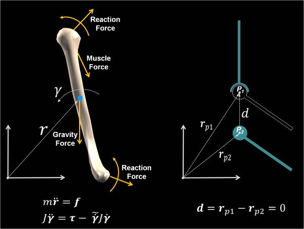 If we assume that the skeletal system consists of rigid bodies connected by joints that provide only specific degrees of freedom (e.g. hinge or ball joints), its movement can be modeled by mechanical dynamic formulation methods that were developed for other multibody systems such as those in robots, automobiles, and spacecraft (Erberhard & Schielen, 2006; Unda, de Jalon, Losantos, & Emparantza, 1987). To simulate the movement of the skeletal system, one must derive the equations that govern its motion and then solve the resulting equations of motion.