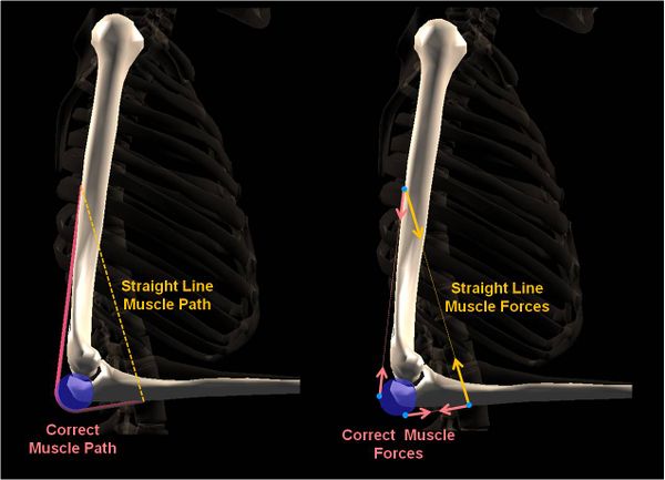 As the muscle stretches from its origin to insertion, it has to negotiate its path around bony surfaces and other muscles and soft tissue, resulting in a curved path (as opposed to a straight-line path from origin to insertion). The correct identification of the musculotendon path for all possible skeletal postures is essential for the correct modeling of the muscle force and its application to the skeletal system. Furthermore, the actual muscle force depends strongly on the muscle fascicle length and velocity, which can be obtained from skeletal posture only if the musculotendon path and series-elasticity is known (see the accompanying article “Models of Muscle Physiology”). The musculotendon applies forces to the skeletal system wherever they come in contact with each other. These points of contact can be identified from the correct modeling of the musculotendon path as it comes in contact with bony surfaces and other tissues along the path. The direction of the muscle forces at the contact points depends on the path of the muscle on either side of those points. Again, accurate modeling of the direction of the muscle force also depends on accurate modeling of the musculotendon path. Modeling the musculotendon path as a straight line is frequently inaccurate, resulting in incorrect muscle forces and incorrect computation of how those forces are actually applied to the skeleton (Figure 4).