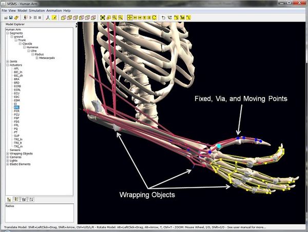 Most clinical applications of modeling software involve inverse dynamical analysis of motion capture data using standard anatomical models with simple parametric scaling for individual morphometry. Many research applications of modeling software require de novo generation of idealized or pathological musculoskeletal models and forward simulations of their kinematics in response to the outputs of model controllers. Such research applications require some additional tools and interfaces. In MSMS, the modeler can interactively build models of arbitrary musculoskeletal and prosthetic systems using 3D graphical tools and wizards. The anatomical models are converted into mechanical dynamics and physiology models that are realized as Simulink blocks, which can be interfaced with control loops and graphical display tools in the popular Matlab environment (Davoodi & Loeb, 2012). MSMS offers a library of physiological components involved in sensorimotor control of movement, including a validated model of muscle force and energetics for mixed fiber-type muscles (Tsianos, Cedric, & Loeb, 2012), and models of proprioceptors including Golgi tendon organs and muscle spindles with fusimotor control (Mileusnic, Brown, Lan, & Loeb, 2006; Mileusnic & Loeb, 2009). The Simulink computations can be linked back to the anatomical model to provide real-time 3D animations (Davoodi, Urata, Hauschild, Khachani, & Loeb, 2007).