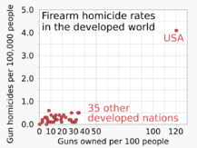 An international study by UNICRI researchers from 2001 examined the link between household gun ownership and overall homicide, overall suicide, as well as gun homicide and gun suicide rates amongst 21 countries. Significant correlations between household gun ownership and rates of gun suicides for both genders, and gun homicide rates involving female victims were found. There were no significant correlations detected for total homicide and suicide rates, as well as gun homicide rates involving male victims.[19] This study has been criticized for combining high-income countries (like the United States) with middle-income countries (like Estonia); if middle-income countries are excluded from the analysis, a strong relationship emerges between gun ownership and homicide.[20] However the Hemenway study has been criticized in response as well. When removing the United States as an outlier and using the superior proxy of gun ownership in the study (percentage of firearm suicides over all suicides), the relationship ceases to be significant. The association between gun ownership and homicide rates across nations is dependent on the inclusion of the U.S.[21] Studies in Canada that examined the levels of gun ownership by province have found no correlations with provincial overall suicide rates.[22] A 2011 study conducted looking at the effects of gun control legislation passed in Canada and the associated effects in homicide rates found no significant reductions in homicide rates as a result of legislation.[23] A case-control study conducted in New Zealand looking at household gun ownership and the risk of suicides found no significant associations.[24]