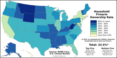 In 2018, the Small Arms Survey reported that there are over one billion small arms distributed globally, of which 857 million (about 85 percent) are in civilian hands.[1][2] The survey stated that American civilians account for an estimated 393 million (about 46 percent) of the worldwide total of civilian held firearms,[2] or about 120.5 firearms for every 100 American residents.[2]