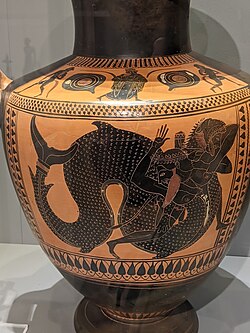 Herakles wrestling Triton is a common theme in Classical Greek art particularly black-figure pottery,[32] but no literature survives that tells the story.[33] In fewer examples, the Greek pottery depicting apparently the same motif are labeled "Nereus" or "Old Man of the Sea" instead, and among these, Nereus' struggle with Herakles is attested in literature (Pseudo-Apollodorus, Bibliotheca).[34] "Old Man of the Sea" is a generic term applicable to Nereus, who was also frequently depicted as half-fishlike.[34][35] One explanation is that some vase painters developed the convention of depicting Nereus as a fully human form, so that Triton had to be substituted in the depiction of the sea-monster wrestling Herakles. And Nereus appears as a spectator in some examples of this motif.[36]