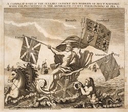 A Triton blowing on a conch on this title page of Alexander Justice, Samuel Pepys and Josiah Burchett: A general treatise of the dominion of the sea, 1710