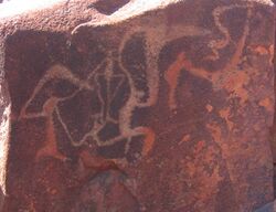 The Aboriginal population of the Pilbara considerably predates, by 30–40,000 years, the European colonisation of the region. Archaeological evidence indicates that people were living in the Pilbara even during the harsh climatic conditions of the Last Glacial Maximum.[14] The early history of the first peoples is held within an oral tradition, archeological evidence and petroglyphs. Near the town of Dampier is a peninsula known as Murujuga, which contains a large collection of World Heritage-listed petroglyphs, dating back thousands of years. Rock art in the Pilbara appears to have been primarily etched into the hard rock surfaces, compared to predominantly paintings on the softer sandstone in the Kimberley. This does not preclude that painting was and is not performed in the Pilbara.