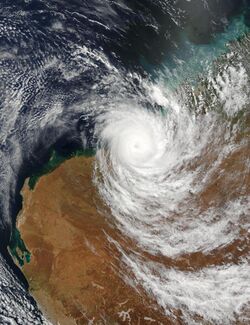 The average annual rainfall in the region is between 200 and 350 millimetres (7.9 and 13.8 in).[6] Almost all of the Pilbara's rainfall occurs between December and May, usually with occasional heavy downpours in thunderstorms or tropical cyclones. The period from June to November is usually completely rainless, with warm to very hot and sunny conditions. Like most of the north coast of Australia, the coastal areas of the Pilbara experience occasional tropical cyclones. The frequency of cyclones crossing the Pilbara coast is about 7 every 10 years.[6][34] Due to the low population density in the Pilbara region, cyclones rarely cause large scale destruction or loss of life.