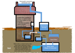 The continuous growth of human populations and the consequent growing need for drinking water is a global problem.[1] Rainwater is an important source of drinking water, and as a free source of water, considerable quantities can be collected from roof catchments and other surface areas for various uses.[2] Due to water shortages, rainfall events and flooding, attention has been given to rainwater management. Rainwater management re-conceptualizes urban rainwater, transforming it from a community risk to a resource for urban development,[3] a good rainwater management is important for the design of sanitation systems and the environment, nowadays different methods of rainwater management have been developed,[4] including reduction of impervious surfaces, separation of rainwater and sanitary sewers, collection and reuse of rainwater, and Low-impact development (LID).