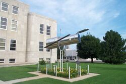 A replica of the Hubble Space Telescope is displayed on the courthouse lawn in Marshfield, Missouri, the hometown of namesake Edwin P. Hubble.[226]