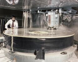 Construction of the Perkin-Elmer mirror began in 1979, starting with a blank manufactured by Corning from their ultra-low expansion glass. To keep the mirror's weight to a minimum it consisted of top and bottom plates, each 25 mm (0.98 in) thick, sandwiching a honeycomb lattice. Perkin-Elmer simulated microgravity by supporting the mirror from the back with 130 rods that exerted varying amounts of force.[41] This ensured the mirror's final shape would be correct and to specification when deployed. Mirror polishing continued until May 1981. NASA reports at the time questioned Perkin-Elmer's managerial structure, and the polishing began to slip behind schedule and over budget. To save money, NASA halted work on the back-up mirror and moved the launch date of the telescope to October 1984.[42] The mirror was completed by the end of 1981; it was washed using 9,100 L (2,000 imp gal; 2,400 US gal) of hot, deionized water and then received a reflective coating of 65 nm-thick aluminum and a protective coating of 25 nm-thick magnesium fluoride.[35][43]