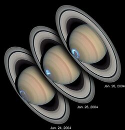 In March 2015, researchers announced that measurements of aurorae around Ganymede, one of Jupiter's moons, revealed that it has a subsurface ocean. Using Hubble to study the motion of its aurorae, the researchers determined that a large saltwater ocean was helping to suppress the interaction between Jupiter's magnetic field and that of Ganymede. The ocean is estimated to be 100 km (60 mi) deep, trapped beneath a 150 km (90 mi) ice crust.[180][181]