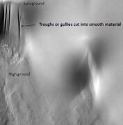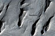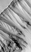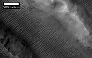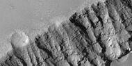 Recurrent slope lineae (RSL) are small dark streaks on slopes that elongate in warm seasons. They may be evidence of liquid water.[37][38][39]
