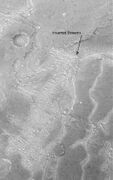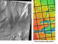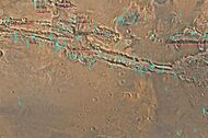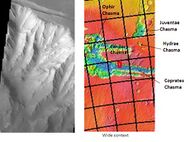 Valles Marineris is the largest canyon system in the solar system; this great canyon would go almost all the way across the United States. The name for the whole system of canyons is Valles Marineris. Starting at the west with Noctis Labyrinthus in the Phoenicis Lacus quadrangle, the canyon system ends in the Margaritifer Sinus quadrangle with Capri Chasma and Eos Chasma (in the south). The word Chasma has been designated by the International Astronomical Union to refer to an elongate, steep-sided depression. Valles Marineris was discovered by and named for the Mariner 9 mission. Moving east from Noctis Labyrinthus, the canyon splits into two troughs, Tithonium Chasma and Ius Chasma (in the south). In the middle of the system are the very wide valleys of Ophir Chasma (north), Candor Chasma, and Melas Chasma (south). Going farther to the east, one comes to Coprates Chasma. At the end of Coprates Chasma, the valley gets wider to form Capri Chasma in the north and Eos Chasma in the south. The walls of the canyons often contain many layers. The floors of some of the canyons contain large deposits of layered materials. Some researchers believe that the layers were formed when water once filled the canyons.[3][6][7][8] The canyons are deep as well as long; in places they are 8-10 kilometers deep, much deeper than the Earth's Grand Canyon, which is only 1.6 kilometers deep.[9]