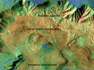 Layers in crater, as seen by HiRISE Light toned material is visible also. Light-toned materials often contain water bearing minerals like sulfates. Only part of the image is in color because the camera only takes a color strip in the center.