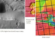 Layers in the canyon wall in Coprates, as seen by Mars Global Surveyor, under the MOC Public Targeting Program.