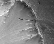 Coprates Chasma Fault, as seen by HiRISE. Layers in the rock face may be from volcanic, lacustrine, and/or aeolian sediments deposited in Valles Marineris.