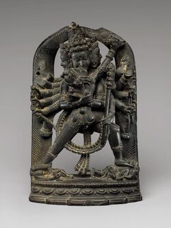 Though the whole northern and Himalayan part of India was involved in the development of tantra, Kashmir was a particularly important center, both Saiva and Buddhist and numerous key tantric texts were written there according to Padoux.[141] According to Alexis Sanderson, the Śaiva Tantra traditions of medieval Kashmir were mainly divided between the dualistic Śaiva Siddhanta and the non-dualist theology found in Śakta lineages like the Trika, Krama and Kaula. The non-dualists generally accepted and made use of sexual and transgressive practices, while the dualists mostly rejected them.[142] Saiva tantra was especially successful because it managed to forge strong ties with South Asian kings who valued the power (shakti) of fierce deities like the warrior goddess Durga as a way to increase their own royal power. These kings took part in royal rituals led by Saiva "royal gurus" in which they were symbolically married to tantric deities and thus became the earthly representative of male gods like Shiva. Saiva tantra could also employ a variety of protection and destruction rituals which could be used for the benefit of the kingdom and the king.[143] Tantric Shaivism was adopted by the kings of Kashmir, as well as by the Somavamshis of Odisha, the Kalachuris, and the Chandelas of Jejakabhukti (in Bundelkhand).[144] There is also evidence of state support from the Cambodian Khmer Empire.[145] As noted by Samuel, in spite of the increased depiction of female goddesses, these tantric traditions all seemed to have been mostly "male-directed and male-controlled."[146]