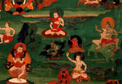 It is only in the seventh and eighth centuries however that we find substantial evidence for these sexual yogas. Unlike previous Upanishadic sexual rituals however, which seem to have been associated with Vedic sacrifice and mundane ends like childbirth, these sexual yogas were associated with the movement of subtle body energies (like Kundalini and Chandali, which were also seen as goddesses), and also with spiritual ends.[129] These practices seemed to have developed at around the same time in both Saiva and Buddhist circles, and are associated with figures such as Tirumülar, Gorakhnath, Virupa, Naropa. The tantric mahasiddhas developed yogic systems with subtle body and sexual elements which could lead to magical powers (siddhis), immortality, as well as spiritual liberation (moksha, nirvana). Sexual yoga was seen as one way of producing a blissful expansion of consciousness that could lead to liberation.[128]