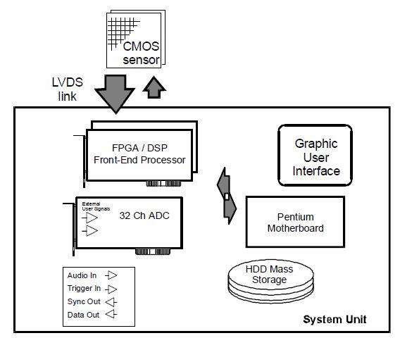 Digital eye-tracking cameras – designed around state-of-the-art CMOS image sensors – are interfaced to a dedicated processor board in the host PC via bi-directional, high speed digital transmission links (400 Mbit/s). This PCI plug-in board carries the front-end processing architecture, consisting of digital signal processors (DSP) and programmable logic devices (FPGA) for binocular, online image and signal acquisition.[3]