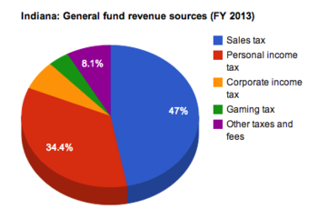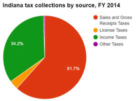 The table below lists 2014 tax collections by source as percentages of total collections. About 61.7 percent of Indiana's total state tax collections came from sales taxes and gross receipts.[5]