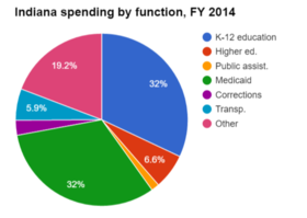 State spending in Indiana can be further broken down by function (elementary and secondary education, public assistance, etc.). Fiscal year 2014 information is included in the table below (information from neighboring states is provided for additional context). Figures are rendered as percentages, indicating the share of the total budget spent per category.[2]