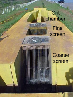 The influent in sewage water passes through a bar screen to remove all large objects like cans, rags, sticks, plastic packets, etc. carried in the sewage stream.[21] This is most commonly done with an automated mechanically raked bar screen in modern plants serving large populations, while in smaller or less modern plants, a manually cleaned screen may be used. The raking action of a mechanical bar screen is typically paced according to the accumulation on the bar screens and/or flow rate. The solids are collected and later disposed in a landfill, or incinerated. Bar screens or mesh screens of varying sizes may be used to optimize solids removal. If gross solids are not removed, they become entrained in pipes and moving parts of the treatment plant, and can cause substantial damage and inefficiency in the process.[22]:9