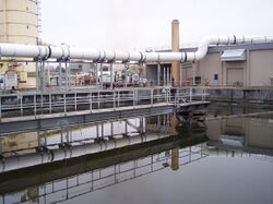 Odors emitted by sewage treatment are typically an indication of an anaerobic or septic condition.[13] Early stages of processing will tend to produce foul-smelling gases, with hydrogen sulfide being most common in generating complaints. Large process plants in urban areas will often treat the odors with carbon reactors, a contact media with bio-slimes, small doses of chlorine, or circulating fluids to biologically capture and metabolize the noxious gases.[14] Other methods of odor control exist, including addition of iron salts, hydrogen peroxide, calcium nitrate, etc. to manage hydrogen sulfide levels.[15]