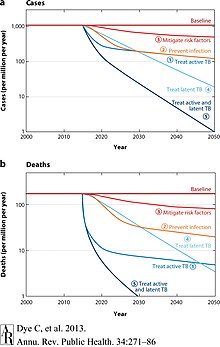 Tuberculosis elimination is the effort to reduce the number of tuberculosis (TB) cases to less than one per 1 million population, contrasted with the effort to completely eradicate infection in humans worldwide.[1] The goal of tuberculosis elimination is hampered by the lack of rapid testing, short and effective treatment courses, and completely effective vaccine.[2] The WHO as well as the Stop TB Partnership aim for the full elimination of TB by 2050—requiring a 1000-fold reduction in tuberculosis incidence.[3] As of 2017, tuberculosis has not been eliminated from any country.[4]