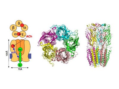 The nicotinic acetylcholine receptor protein contains a binding site(s) for the neurotransmitter ACh and an intrinsic cationic channel specific for Na+, K+ and Ca2+ ions (in some brain subtypes) together with the physical mechanism that links the binding of ACh to the opening of the ion channel. In some invertebrates the nAChR contains an anion channel. The nAChR mediates in less than 1 ms, the transduction of neurotransmitter binding into an electrical signal and on a longer ms to min time-scale it is desensitized toward a high affinity closed state. The nAChR is a transmembrane pentameric glycoprotein of about 300,000 Da that appears by electron microscopy as a cylinder of ca 16nm in length and ca 8nm in diameter, the long axis being perpendicular to the membrane plane. Along the symmetry axis, a low electron density path delineates the ion channel, which mainly consists of a water pore running through the entire length of the protein. Viewed from the synaptic cleft the nAChR suggests a pseudo-symmetrical pentameric rosette, each petal of the rosette corresponding to a single nAChR subunit. The muscle/electric organ nicotinic acetylcholine receptor is composed of four different types of subunits, named α1, β1, γ1 and δ1 according to their apparent molecular weight, that associate into a pentamer with an α2βγδ stoichiometry and a (αγαδβ) organisation. Neuronal nicotinic receptors are made up of different subunits associated in a variety of combinations.