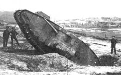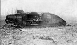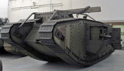 ![]() A British Mark I "male" tank near Thiepval on 25 September 1916, fitted with wire mesh to deflect grenades and the initial steering tail, shown raised. Photograph by Ernest Brooks | |