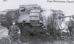 The German army recovered about 50 abandoned British Mark IV tanks from the Cambrai battlefield and were able to restore some 30 of them to running order. One was taken to Berlin and was demonstrated to the Kaiser, while the others went to a captured engineering plant near Charleroi for refurbishment. The machine guns were retained but rechambered to fire German ammunition, while the 6-pounders were replaced by captured Belgian 57 mm Nordenfelt guns. The captured tanks were painted with prominent Iron Cross emblems and a bold disruptive camouflage pattern, although some appear to have retained the original khaki colour scheme.[29] Although some of these tanks were used in the German Spring Offensive, they tended to be deployed in small numbers for mopping-up operations,[30] while officers reported that they were unable to keep up with the fast-moving infantry. In the aftermath of the offensive, some 300 abandoned British tanks were behind German lines, of which 170 were reported to be repairable. By the end of the war, there were seven German tank battalions equipped with captured British tanks.[31]