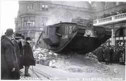 Tanks were celebrated in music hall songs such as The Tanks that Broke the Ranks[37] and manufacturers were soon producing toy tanks, tank teapots, tank-shaped handbags and tank fairground rides.[38] Following the appearance in London of several tanks at the Lord Mayor's Show in November 1917, one was dispatched to Trafalgar Square, where an immense crowd was encouraged to buy National War Bonds to help finance the war. Following that success, starting with a "Tank Week" held in March 1918, tanks, known as "Tank Banks", and other military vehicles were displayed at bond-selling events across the country. Citizens were encouraged to save small change towards buying more bonds in miniature "tank banks", small ceramic piggy banks in the shape of a tank.[39] A competition ensued to see which British city or town could raise the most in relation to their population.[40]