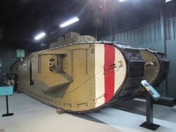 The Mark IV was a more heavily armoured version of the Mark I, and went into production in May 1917. Fundamental mechanical improvements had originally been intended, but had to be postponed. The main change was the introduction of the QF 6-pounder 6 cwt Hotchkiss, a shorter-barrelled version of the earlier gun. Improved 12 mm armour made it impervious to German armour-piercing rifle bullets. Lewis guns replaced the Hotchkiss and Vickers machine guns in both the male and female variants, although the air-cooling system of the Lewis proved problematic and the Hotchkiss was later readopted. It had all its fuel stored in a single external tank, located between the rear track horns, in an attempt to improve crew safety. The smaller sponsons could be swung inwards on hinges to reduce the width of the tank for rail transportation, where previous models had required partial disassembly to fit within the loading gauge. Rails on the roof carried an unditching beam whose purpose was to help extricate the tank from difficult trenches by attaching it to the tracks. A total of 1,220 were built: 420 males, 595 females and 205 tank tenders, which were supply tanks.[23]