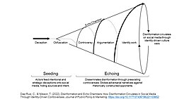 Whereas disinformation research focuses primarily on how actors orchestrate deceptions on social media, primarily via fake news, new research investigates how people take what started as deceptions and circulate them as their personal views.[5] As a result, research shows that disinformation can be conceptualized as a program that encourages engagement in oppositional fantasies (i.e., culture wars), through which disinformation circulates as rhetorical ammunition for never-ending arguments.[5] As disinformation entangles with culture wars, identity-driven controversies constitute a vehicle through which disinformation disseminates on social media. This means that disinformation thrives, not despite raucous grudges but because of them. The reason is that controversies provide fertile ground for never-ending debates that solidify points of view.[5]