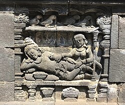 Jamu is believed to have originated in the Mataram Kingdom era, c. 1300 years ago. The stone mortar and pestle with long cylindrical stone mortar — the type commonly used in today's traditional jamu making, was discovered in Liyangan archaeological site on the slopes of Mount Sundoro, Central Java. The site and relics are dated from Mataram Kingdom era circa 8th to 10th century, which suggest that the herbal medicine tradition of jamu had already taken hold by then.[18] The bas-reliefs on Borobudur depict images of people grinding something with stone mortar and pestle, drink sellers, physicians and masseuse treating their clients.[14] All of these scenes might be interpreted as a traditional herbal medicine and health-related treatments in ancient Java. The Madhawapura inscription from Majapahit period mentioned a specific profession of herb mixer and combiner (herbalist), called Acaraki.[14] The medicine book from Mataram dated from circa 1700 contains 3,000 entries of jamu recipes, while Javanese classical literature Serat Centhini (1814) describes some jamu herbal concoction recipes.[14]
