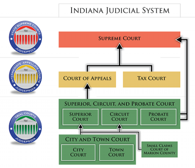 Indiana Supreme Court • Indiana Court of Appeals • Indiana Superior Courts • Indiana Circuit Courts • Indiana Small Claims Courts • St. Joseph County Probate Court, Indiana • Indiana Tax Court • Indiana Municipal Courts