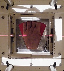 | Radiation therapy being administed to a skin cancer on the arm | |