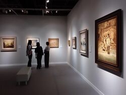 The international art fair, occurring typically every two years, has become a major force in the marketing of contemporary fine art. Commercial art fairs are essentially temporary galleries that benefit from the attraction of public interest and competition between collectors.[8] One of the most successful, Art Basel originated in Switzerland in the 1970s, expanded to Miami in 2000 and Hong Kong in 2010.[9] Art Basel built on the model of Art Cologne, the first fair sponsored by and for commercial galleries; in contrast to the government sponsored world's fairs that began in the Victorian era. One of the latter, the Venice Biennale founded in 1895, continues to operate as a public foundation with national pavilions.