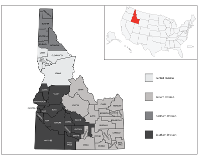 The Southern Division, covering Ada, Adams, Blaine, Boise, Camas, Canyon, Elmore, Gem, Gooding, Jerome, Lincoln, Owyhee, Payette, Twin Falls, Valley and Washington counties.