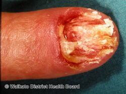 Acral lentiginous melanoma is a type of skin cancer.[2] It typically begins as a uniform brownish mark before becoming darker and wider with a blurred irregular edge, most frequently seen in the foot of a person with darker skin.[2] It may become bumpy and ulcerate.[2] Just under the nails and the fingers can also be affected, and it may spread.[2]