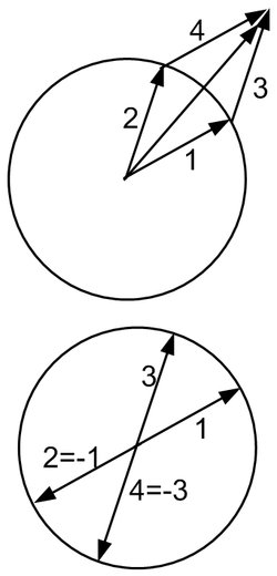 Before describing the process in detail, let consider some major results that can be anticipated easily, provided we ignore some subtleties. Consider an interaction \( u(K_1,..K_4)\) describing two incoming fermions of momenta \( (K_1, K_2) \) scattering into two particles with momenta \( (K_3, K_4) \ .\) In the limit of vanishing bandwidth \( \Lambda \ ,\) all four momenta lie on the Fermi circle \( |K_i|=K_F \ .\) Together with momentum conservation, this implies that the incoming momenta and outgoing momenta are identical up to a permutation, as depicted in the upper half of Figure 3. Thus we find (upon invoking rotational invariance) \[\tag{8} u=u(\theta_1, \theta_2)= u(\theta_1- \theta_2)\equiv F(\theta ) \ .\]